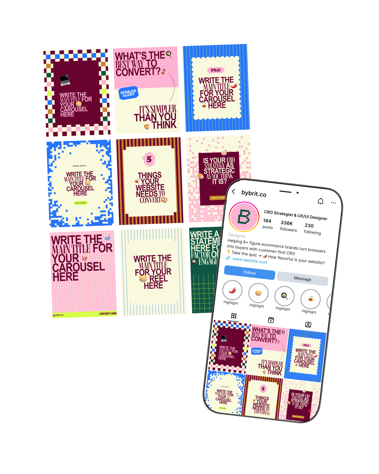 The best way to beat a social media slump? Gorge templates, obviously. I’ll design custom, on-brand graphics your audience will recognize in half a scroll—and you’ll be excited to hit “publish” again.